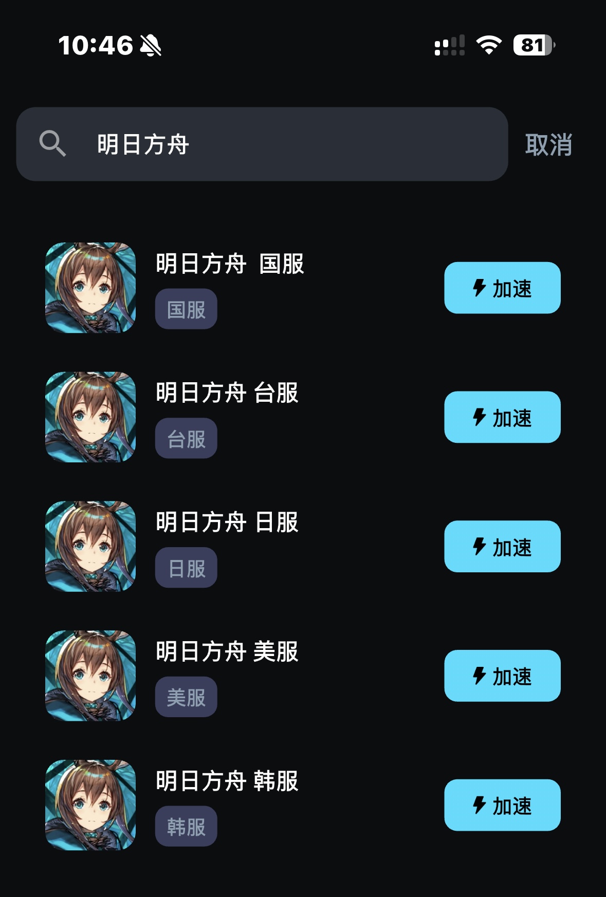 - 搜索游戏:在搜索栏输入“明日方舟”,你会看到不同服务器的选项(国服、日服、国际服等)。