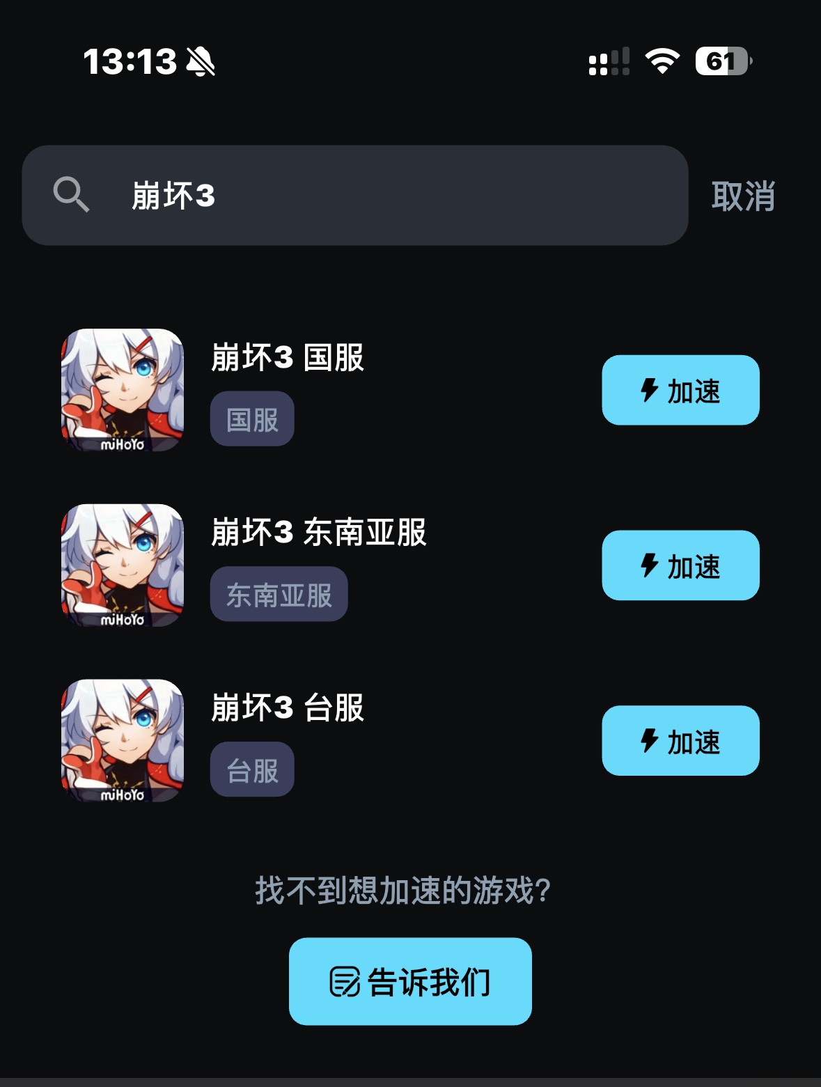 - 一键加速:打开APP,搜索崩坏3。点击游戏图标旁边的“加速”按钮。