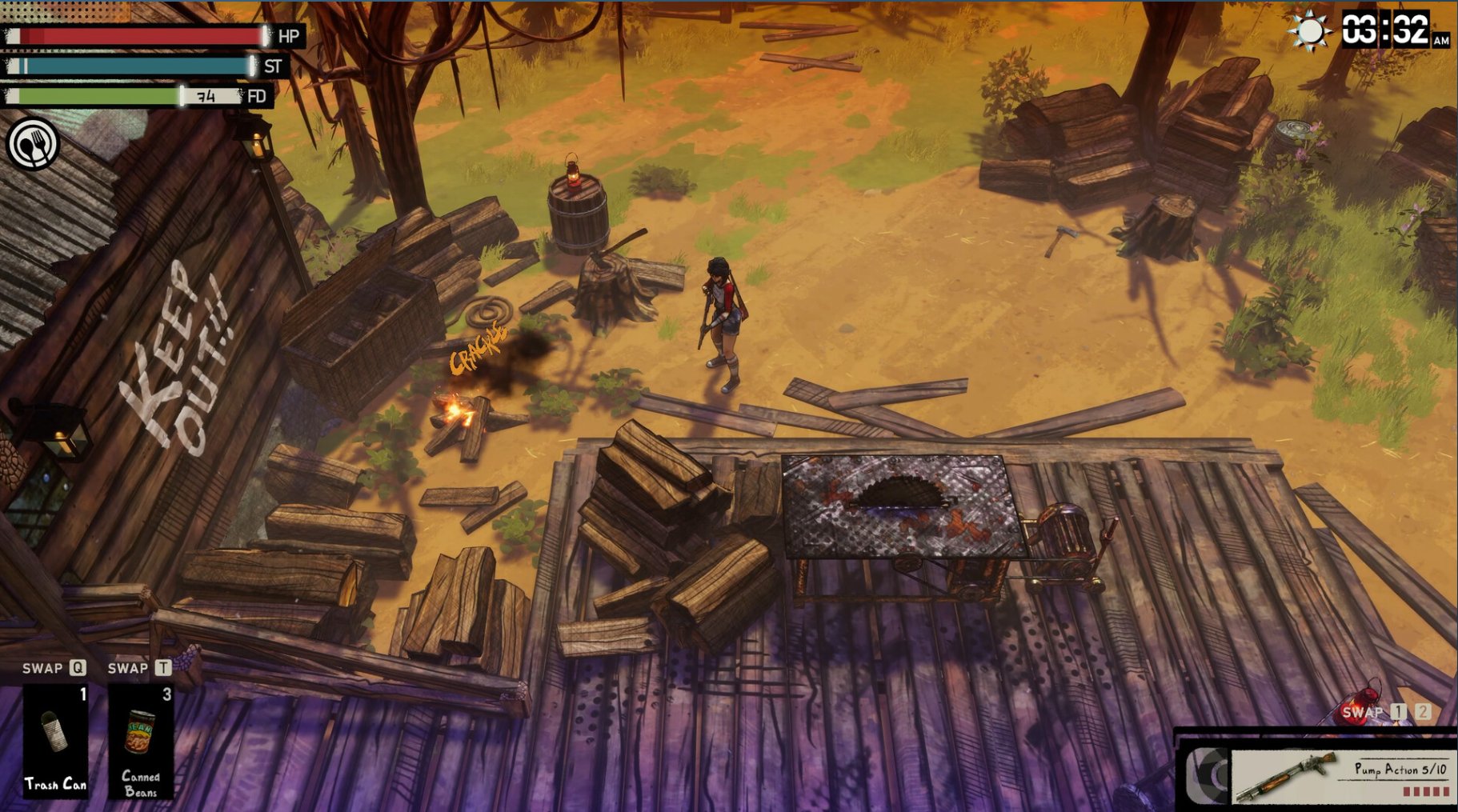 作为玩家,你不仅要面对那些造型怪诞、仿佛从B级恐怖片片场跑出来的怪物,还要时刻关注自己的生理指标。资源搜集是生存的核心——从废弃的五金店寻找螺丝,到在幽暗的森林里通过砍伐获取木材,每一项物资都至关重要。
